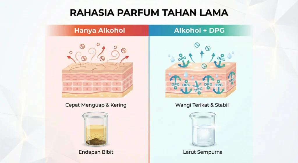 Salah satu keluhan paling umum dari konsumen adalah wangi parfum yang cepat hilang. Alkohol memang berfungsi untuk mengangkat aroma (lifting) agar menyebar, tapi sifatnya sangat cepat menguap. DPG memiliki peran teknis sebagai fixative atau pengikat untuk menyeimbangkan hal ini.