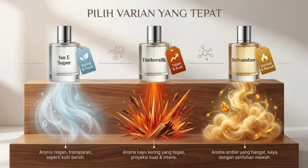 Sebagai pemilik brand, kamu perlu tahu bahwa ada beberapa varian Iso E Super di pasaran dengan karakteristik berbeda. Pemilihan varian yang tepat akan sangat mempengaruhi karakter akhir produkmu.