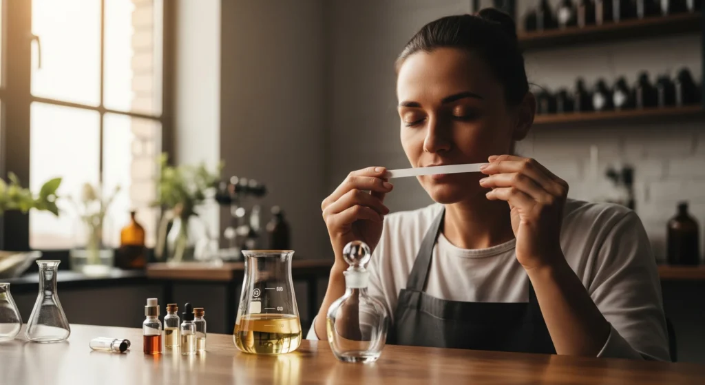 Alkohol teknis mengandung senyawa pengganggu organik seperti minyak fusel, asetaldehid, dan keton. Bau “asing” dan tajam dari senyawa ini akan bertabrakan dengan top notes parfum kamu. Bayangkan aroma citrus atau floral yang seharusnya segar dan memikat, tiba-tiba tertutup oleh bau pelarut yang apek. Ini merusak kesan pertama (first impression) yang sangat krusial dalam penjualan parfum.