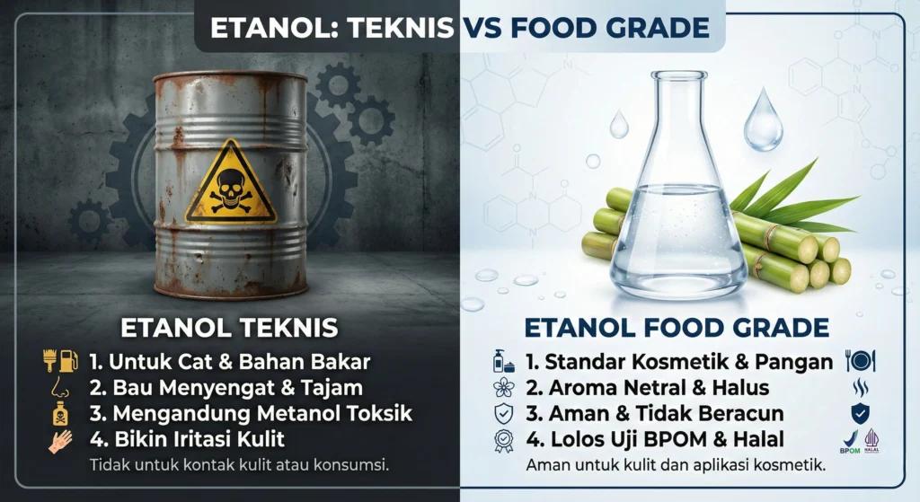 Ini adalah poin paling krusial yang menyangkut keamanan konsumenmu. Etanol teknis sering kali mengandung metanol dalam kadar yang tinggi karena proses pemurnian yang tidak sempurna.