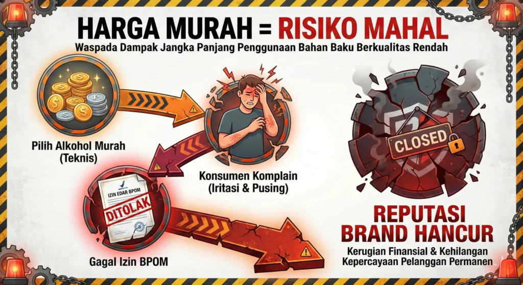 Mungkin selisih harga bahan baku antara alkohol teknis dan food grade terlihat menggoda untuk menekan biaya produksi di awal. Namun, cobalah hitung ulang: penghematan seribu atau dua ribu rupiah per botol sama sekali tidak sebanding dengan risiko rusaknya reputasi brand yang sudah kamu bangun dengan susah payah.