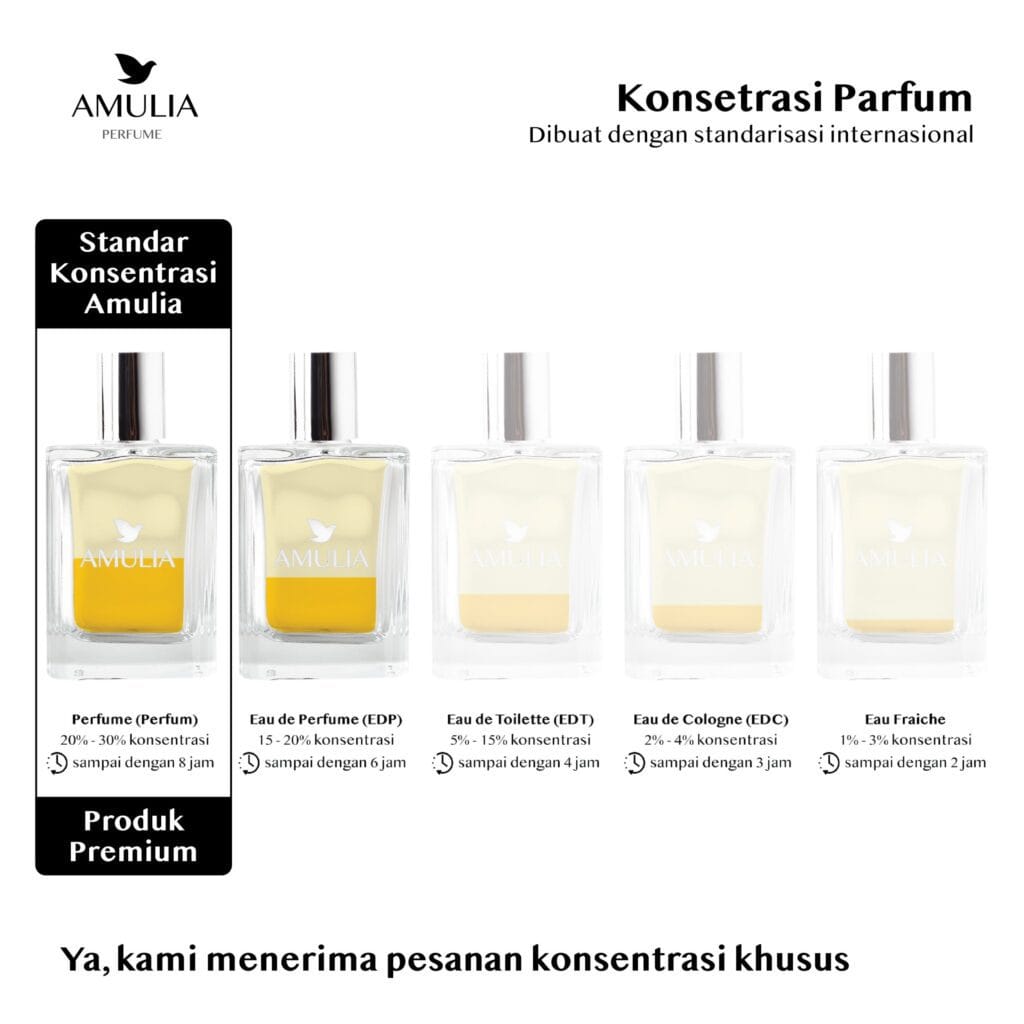 Di tempat pembuatan parfum merek sendiri Amulia Parfum, kami selalu berusaha memberikan yang terbaik. Maka dari itu kami menggunakan standar konsentrasi internasional perfume untuk hasil terbaik.