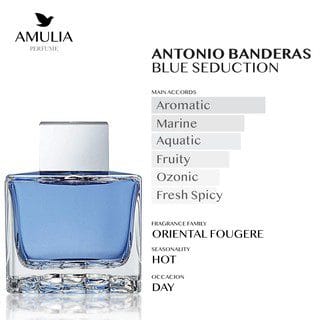 Antonio Banderas Blue Seduction adalah parfum pria bergaya modern dan maskulin yang diluncurkan pada 2007. Menurut Antonio Banderas, parfum ini mencerminkan bagian dari dirinya dan budayanya. Didesain untuk pria berusia 25–35 tahun, Blue Seduction menghadirkan aroma segar dan menggoda dari perpaduan bergamot, cassis, mint, melon, dan apple, diperkaya dengan sentuhan spicy dari cardamom dan nutmeg, serta nuansa unik dari cappuccino dan ocean accord. Ditutup dengan aroma hangat dari musk, oak moss, dan kayu, parfum ini cocok untuk aktivitas harian maupun acara kasual.