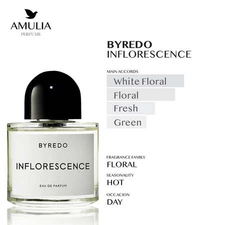 Byredo Inflorescence adalah parfum floral yang diluncurkan pada musim semi 2013 sebagai perayaan atas mekarnya alam dan kehidupan baru. Terinspirasi oleh taman liar yang sedang mencapai puncak keindahan bunganya, parfum ini menyatukan aroma floral yang kaya, manis, dan segar. Komposisinya dibuka dengan paduan kelopak mawar yang memabukkan dan freesia merah muda beraroma madu. Di bagian tengah, hadir kesegaran hijau-sitrus dari lily of the valley dan magnolia yang creamy, sebelum ditutup dengan wangi jasmine yang manis dan mewah. Hasilnya adalah aroma musim semi yang lembut, elegan, dan membangkitkan semangat.​