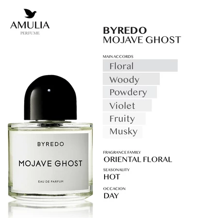 Mojave Ghost dari Byredo adalah parfum beraroma Oriental Floral yang dirancang untuk pria dan wanita. Diluncurkan pada tahun 2014, aroma ini terinspirasi dari keindahan gurun Mojave yang sunyi dan misterius. Parfum ini dibuka dengan sentuhan manis dan eksotis dari buah sapodilla dan kehangatan ambrette, menciptakan kesan awal yang lembut dan menggoda. Di bagian tengah, keharuman bunga magnolia dan violet berpadu harmonis dengan aroma creamy dari sandalwood. Lapisan dasar yang terdiri dari ambergris, cedar, dan musk memberikan nuansa hangat, sensual, dan tahan lama. Mojave Ghost mencerminkan keanggunan tersembunyi dalam kesunyian gurun.