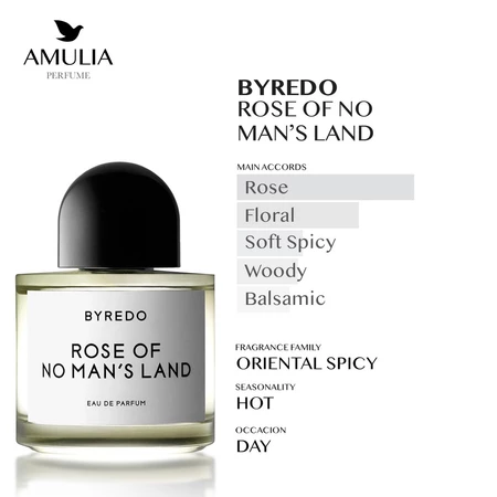 Rose of No Man’s Land dari Byredo adalah parfum beraroma Oriental Spicy yang diciptakan untuk pria dan wanita. Diluncurkan pada tahun 2015, parfum ini merupakan penghormatan terhadap para perawat heroik di medan perang, simbol kelembutan di tengah kekacauan. Aroma dibuka dengan keharuman lembut namun tegas dari mawar merah Turki dan semburat pedas pink pepper. Di bagian tengah, keindahan kelopak mawar kembali hadir, diperkaya dengan nuansa manis dan lembut dari raspberry bloom. Lapisan dasar ditutup dengan aroma kayu papyrus dan kehangatan amber, menciptakan kesan hangat, menyentuh, dan penuh rasa empati.