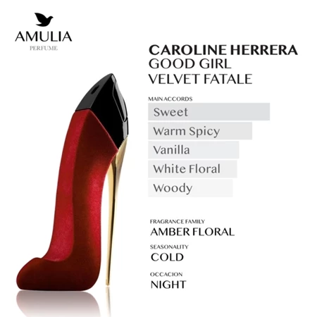 Good Girl Velvet Fatale dari Carolina Herrera adalah parfum wanita beraroma Oriental Floral yang diluncurkan sebagai edisi kolektor pada tahun 2018. Diciptakan oleh Louise Turner, versi ini merupakan kelanjutan dari kesuksesan Good Girl original yang dirilis pada 2016. Parfum ini hadir dalam botol ikonik berbentuk stiletto yang dibalut beludru merah mewah dengan sentuhan detail emas, menggambarkan kesan glamor dan menggoda. Komposisinya menggabungkan aroma almond, kopi, lemon, dan bergamot di bagian atas, diikuti oleh keharuman bunga tuberose, melati, mawar Bulgaria, dan orange blossom. Basisnya yang kaya berisi praline, tonka bean, kakao, vanila, kayu-kayuan, dan rempah yang sensual. Good Girl Velvet Fatale adalah senjata rahasia bagi wanita yang ingin menguasai seni menggoda.