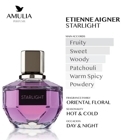 Starlight by Etienne Aigner adalah parfum Oriental Floral yang dirilis pada tahun 2008, menghadirkan keanggunan dan misteri. Dengan top notes dari pineapple dan bergamot, parfum ini memberikan kesegaran buah yang menyegarkan dan energik. Di lapisan tengah, big strawberry, caraway, dan jasmine menciptakan harmoni antara manisnya buah, rempah, dan keharuman bunga yang elegan, menambah kedalaman pada komposisi. Base notes yang terdiri dari patchouli, vanilla, sandalwood, dan musk memberikan sentuhan hangat, sensual, dan mewah, menjadikannya parfum yang sangat cocok untuk wanita yang percaya diri dan penuh gaya. Starlight menggambarkan wanita modern yang bercahaya dengan pesona dan keanggunannya, membawa kita pada dunia impian dan ekspektasi.