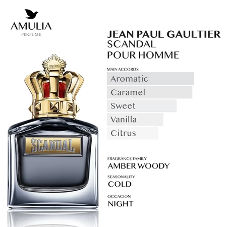 Scandal Pour Homme oleh Jean Paul Gaultier adalah parfum pria dengan kategori Oriental Woody yang diluncurkan pada tahun 2021. Diciptakan oleh Quentin Bisch, Christophe Raynaud, dan Natalie Gracia-Cetto, parfum ini menggambarkan karakter kuat, sensual, dan provokatif, terinspirasi dari dunia tinju dan jiwa bebas khas Jean Paul Gaultier. Top notes dari mandarin orange dan clary sage memberi kesegaran tajam dan energik, diikuti oleh middle notes berupa caramel dan tonka bean yang manis dan adiktif. Ditutup oleh base note vetiver yang memberi kesan maskulin, segar, dan penuh karisma. Dikemas dalam botol kokoh berbentuk mahkota sang juara, parfum ini memancarkan keberanian, gairah, dan kemenangan.