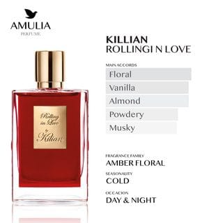 Rolling in Love dari By Kilian adalah parfum dengan karakter Oriental Floral yang memikat, diciptakan untuk pria dan wanita. Diluncurkan pada tahun 2019, parfum ini merupakan karya dari perfumer ternama Pascal Gaurin. Aroma ini membuka dengan kesan lembut dan creamy dari susu almond dan ambrette (biji musk mallow) yang memberi nuansa hangat dan nyaman. Di tengah, lapisan floral seperti iris, freesia, heliotrope, peony, serta sentuhan manis raspberry dan hedione menciptakan kesan romantis dan elegan. Basis aromanya memanjakan dengan kombinasi sensual dari tuberose, vanila, tonka bean, musk, lactones, dan sentuhan karamel. Rolling in Love bagaikan pelukan hangat, manis, dan penuh kelembutan yang membangkitkan rasa jatuh cinta.