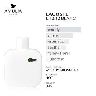 Eau de Lacoste L.12.12 Blanc Limited Edition dari Lacoste Fragrances adalah parfum pria beraroma Woody Aromatic yang elegan dan maskulin, diluncurkan pada tahun 2014. Parfum ini dibuka dengan sentuhan segar dan energik dari grapefruit, rosemary, daun cedar, serta aroma hangat dari kapulaga. Di bagian tengah, hadir kombinasi unik dari bunga ylang-ylang dan tuberose yang memberikan nuansa lembut dan eksotis. Sementara itu, lapisan dasar menyuguhkan keharuman mendalam dari kayu cedar Virginian, vetiver, serta aksen kulit dan suede yang memberikan kesan mewah dan tahan lama. Cocok untuk pria modern yang percaya diri dan bergaya.