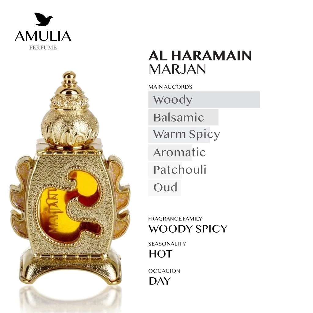 Al Haramain Marjan adalah parfum oriental yang elegan dan menggoda, dirilis oleh rumah parfum Al Haramain yang dikenal dengan koleksi wewangian mewah dan berkualitas tinggi. Marjan menawarkan pengalaman olfaktif yang memikat dengan keseimbangan antara aroma bunga, buah, dan kayu yang dalam, menciptakan kesan yang kaya dan misterius. Parfum ini dibuka dengan keharuman buah yang segar dan manis, terutama peach (persik) yang lembut, disertai dengan sentuhan buah apple yang memberi kesan segar. Di jantungnya, terdapat kombinasi bunga yang elegan, seperti jasmine dan rose, yang memberikan nuansa feminin dan anggun, berpadu sempurna dengan aroma buah pada bagian awal. Pada dasar parfum, Marjan menghadirkan kedalaman dan kehangatan dari oud (agarwood) yang khas, dipadukan dengan sandalwood dan musk, menciptakan kesan maskulin, memikat, dan sensual, yang memperkaya keseluruhan komposisi parfum ini. Al Haramain Marjan adalah pilihan sempurna bagi mereka yang menyukai parfum oriental dengan karakter yang kuat namun tetap elegan, cocok untuk berbagai kesempatan, baik formal maupun santai, dan memberikan kesan yang memikat dan penuh daya tarik.