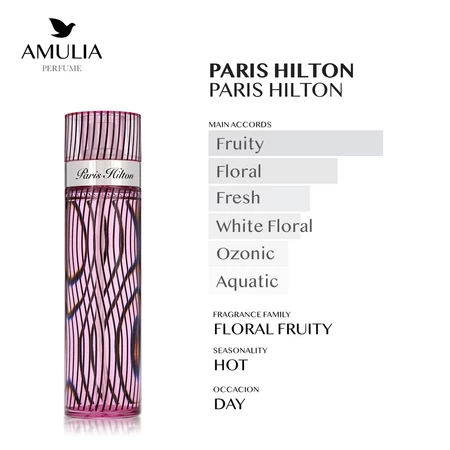 Paris Hilton oleh Paris Hilton adalah parfum wanita bergaya Floral Fruity yang diluncurkan pada tahun 2005, dan menjadi parfum pertama yang membawa namanya. Diciptakan oleh Steve DeMercado dan James Krivda, parfum ini mencerminkan kepribadian Paris yang glamor, berani, dan penuh pesona. Aromanya dimulai dengan top notes segar dan menggoda dari melon, apple, dan peach. Di bagian tengah, middle notes menyuguhkan paduan bunga yang kaya dan feminin seperti freesia, mimosa, jasmine, lily-of-the-valley, lily, dan tuberose. Aroma ditutup dengan base notes hangat dan lembut dari musk, ylang-ylang, sandalwood, dan oakmoss.