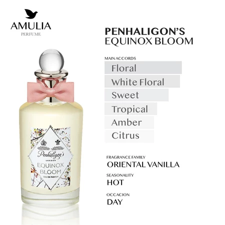 Equinox Bloom oleh Penhaligon’s adalah parfum Oriental Vanilla untuk pria dan wanita, diluncurkan pada tahun 2016 dan diciptakan oleh Olivier Cresp. Terinspirasi dari kemewahan tradisi afternoon tea dan awal musim semi, parfum ini memadukan aroma floral yang lembut dengan sentuhan gourmand yang menggoda. Top notes terdiri dari Neroli, Hortensia, dan Violet Leaf, diikuti oleh middle notes Frangipani, Jasmine Sambac, dan Orange Blossom yang menghadirkan keharuman bunga tropis dan elegan. Base notes dari Brown Sugar, Ambroxan, dan Siam Benzoin memberi kedalaman manis dan oriental. Equinox Bloom adalah perpaduan harmonis antara kelembutan dan kemewahan, menawarkan aroma yang hangat, manis, dan menenangkan.