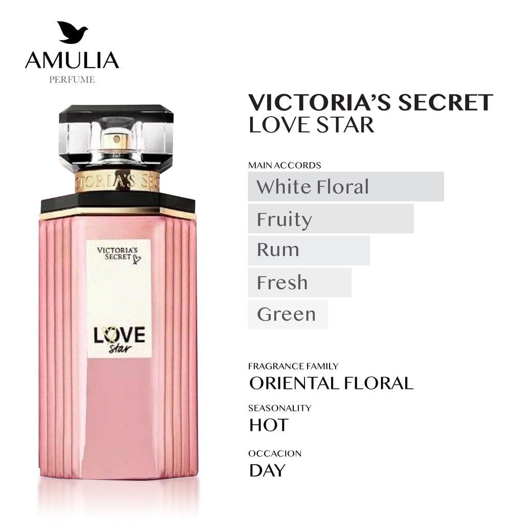 Love Star dari Victoria’s Secret adalah parfum dengan karakter oriental floral (perpaduan aroma bunga dan nuansa hangat oriental) yang elegan dan menggoda, dirancang khusus untuk wanita. Parfum ini diluncurkan pada tahun 2018 dan menawarkan kombinasi aroma yang unik dan memikat.