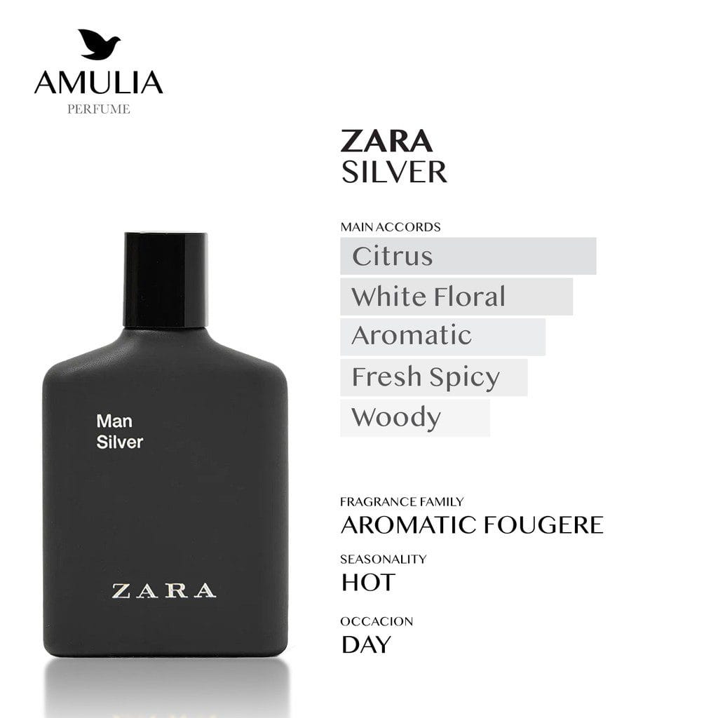 Zara Silver oleh Zara adalah parfum dengan aroma citrus aromatic yang dirancang khusus untuk pria. Parfum ini menghadirkan kesegaran maskulin yang ringan namun tetap berkarakter. Di awal, perpaduan lime dan lemon memberikan sentuhan segar dan energik yang langsung membangkitkan semangat. Aroma berlanjut ke geranium, bunga yang memberikan nuansa hijau dan sedikit pedas, memperkaya lapisan tengah parfum. Sebagai penutup, hadir kombinasi musk dan vetiver yang memberikan kesan bersih, hangat, dan elegan. Zara Silver cocok digunakan untuk aktivitas sehari-hari, terutama di siang hari, oleh pria yang aktif dan menyukai kesegaran yang tahan lama.